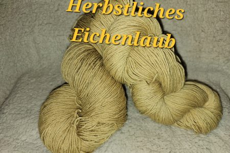 auch der Herbst verteilt seine Farben noch kräftig an die Wolle. Hier wurde 4fach und 6fach Sockenwolle mit abgefallenem Laub der Eiche gefärbt. Ein wunderbarer goldener Gelbton kam dabei heraus.